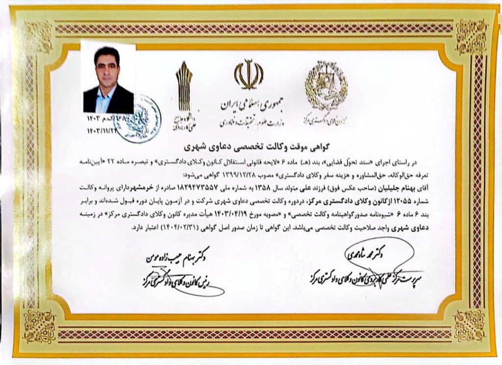 من، بهنام جلیلیان، وکیل پایه یک دادگستری با شماره پروانه 12055، از سال 1386 با هدف ارائه خدمات حقوقی تخصصی و به صورت حرفه ای در حوزههای مختلف وکالت حقوقی فعالیت خود را آغاز کردم. حوزه اصلی فعالیتم شامل دعاوی خانواده (مهریه، طلاق، حضانت) ، امور مرتبط با شهرداری ها انواع کمیسیون های شهرداری و تصرف ملک ، دعاوی ملکی (قراردادنویسی، نظارت ، الزام به تنظیم سند، تصرف عدوانی)، امور کیفری (کلاهبرداری، سرقت، جرائم اینترنتی) و امور قراردادها (تنظیم، بازبینی و حل اختلافات ناشی از قراردادها) است.